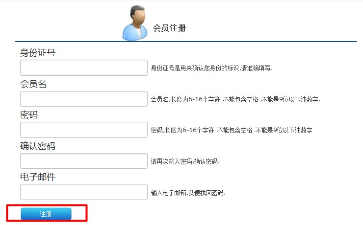 2.2第一次登陸預(yù)約系統(tǒng)后進(jìn)行用戶注冊,依次填寫學(xué)員的【身份證號碼】,系統(tǒng)登陸的【會員名】,兩次輸入【登陸密碼】,以及【電子郵箱】,輸入完成后點擊注冊,會有注冊成功的提示框;